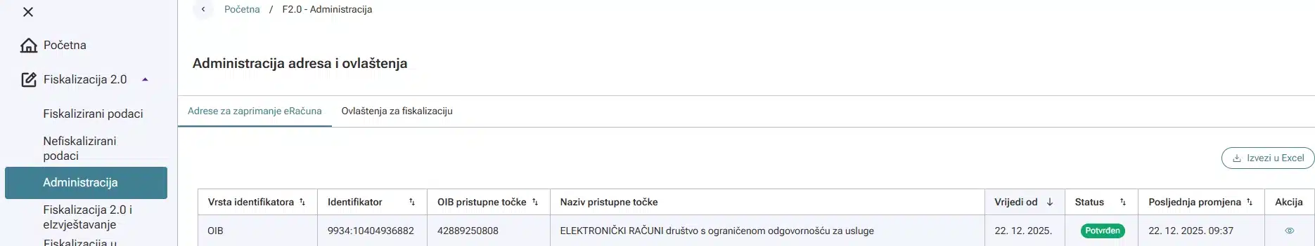 Nakon uspješno provedene potvrde, vaš status adrese za zaprimanje eRačuna je ‘potvrđen’ i zelene je boje.