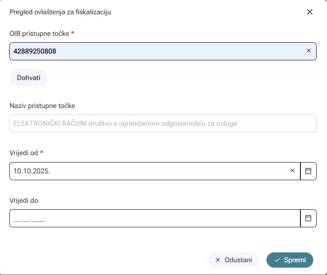 U ovlaštenjima za fiskalizaciju ćete vidjeti vaš odabir iz ekrana prije.